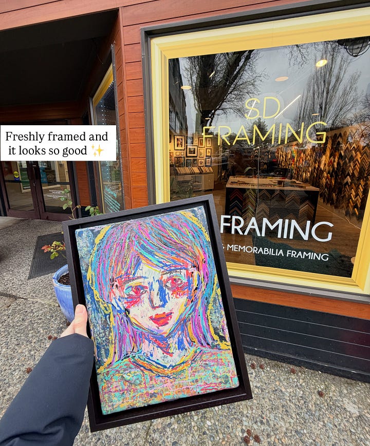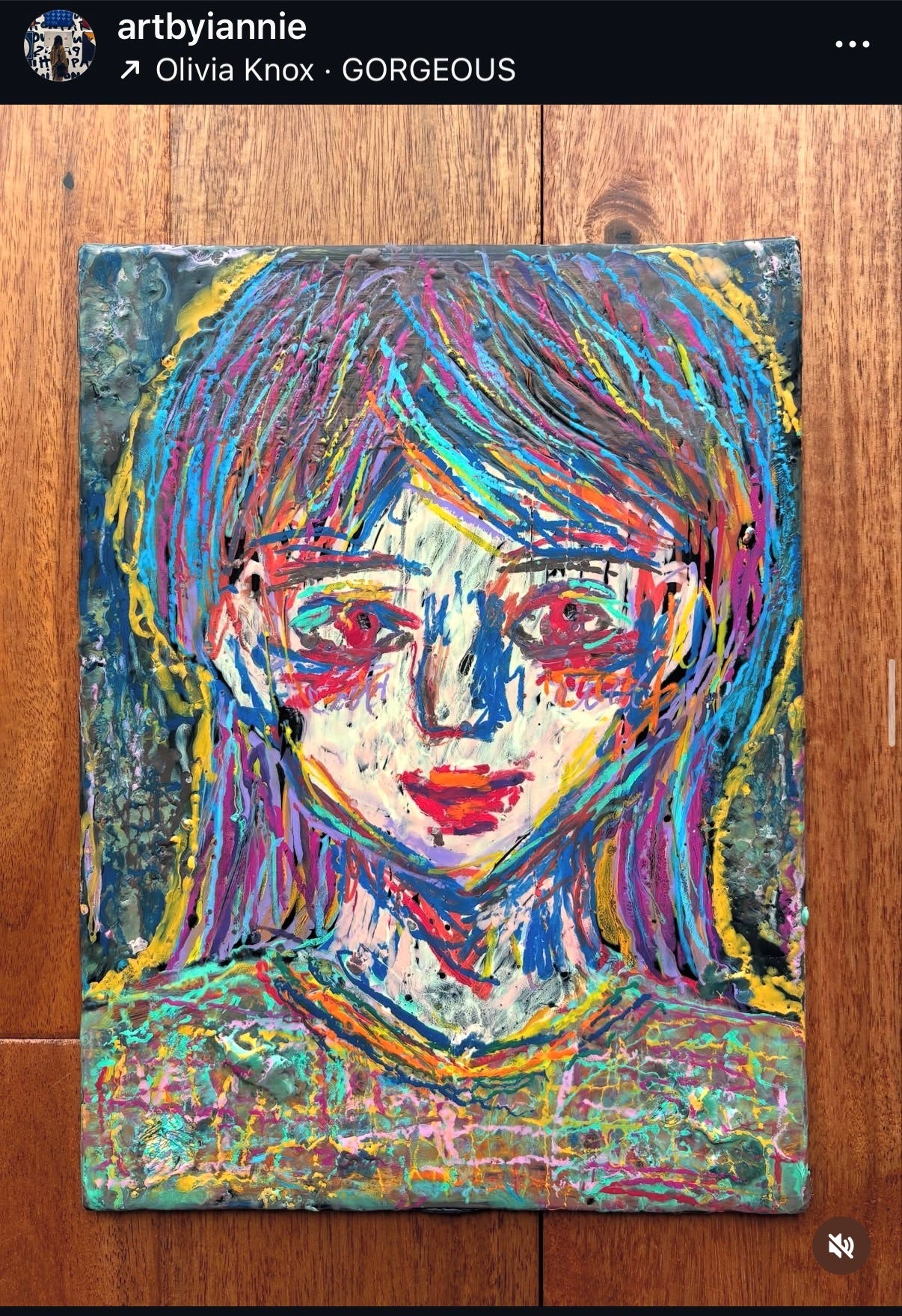 Since then, I’ve committed to my creative passions, taking art classes and experimenting with encaustic and oil - mediums that I was too intimidated to try. A year later, it feels surreal to see my own work hanging on a gallery wall. I painted this self-portrait purely from intuition, with visible marks of mistakes made during my experimentation. This piece reminds me that failures don’t make our lives any less beautiful; they are the marks that make the final portrait feel complete.