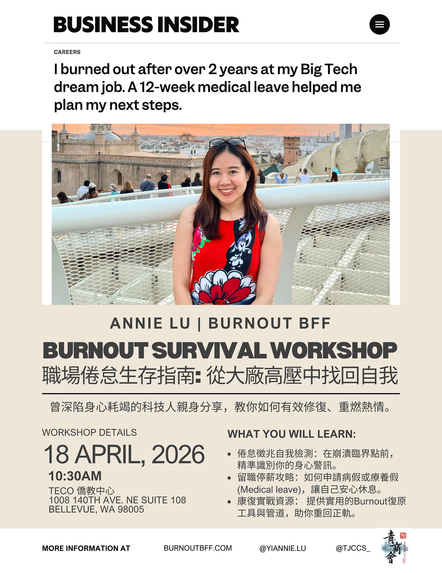 I’m thrilled to announce that I’m hosting a burnout workshop for the Taiwanese community in the Seattle area on April 18th. You can register for free here.