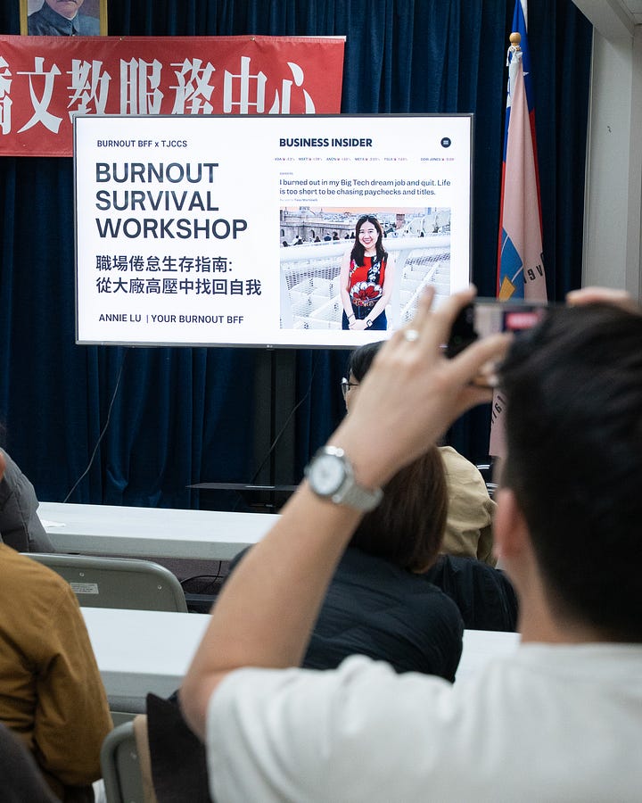 Last week, I hosted my first in-person burnout recovery workshop for the Taiwanese Community in Seattle. We sat down with over 30 professionals in tech to talk about the unspoken truths of our community: the weight of the “model minority” myth, the pressure of high-performance work environments, and the cultural expectations that demand we just “work harder.”