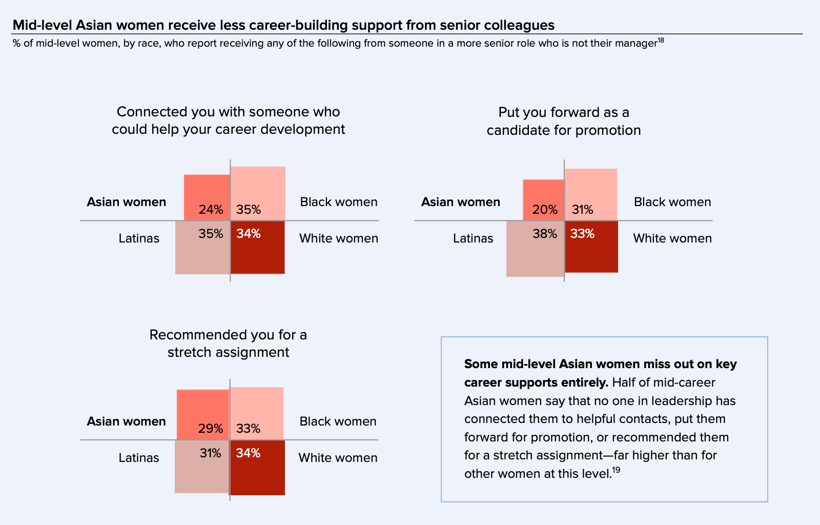 Specifically, Asian women face even more barriers when it comes to advancing into leadership roles in corporate America due to the “Double Bind” bias. We are often told we lack the assertiveness required for leadership, yet we are penalized as aggressive or difficult when we do speak up and go against expectations. (Ask any Asian woman - she’s likely been given feedback to be “more visible” while simultaneously being silenced and ignored.)